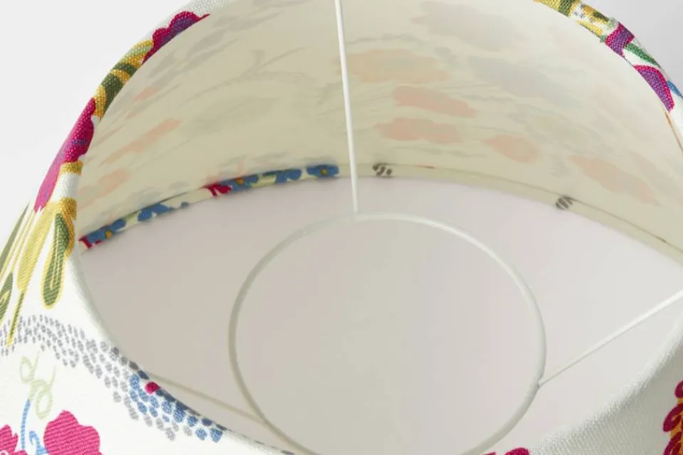 Lampskärm 1257 passar Golvlampa 2326 och 2568. Den används tillsammans med en lyra med ring som säljs separat. Varje enskild lampskärm är unik och mönstrets placering varierar därför från skärmen på bilden.