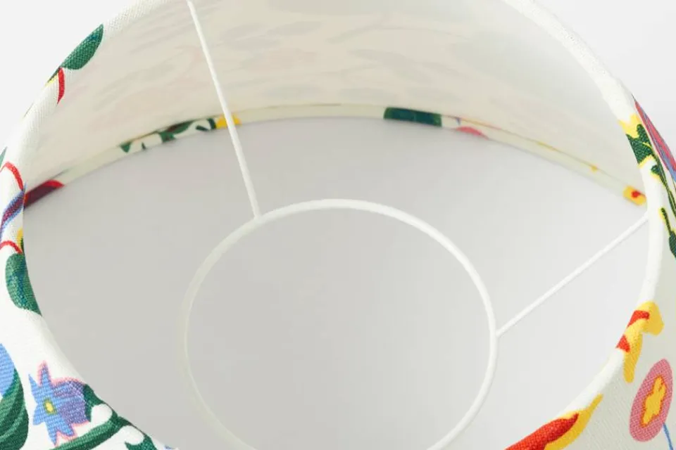 Lampskärm 1257 passar Golvlampa 2326 och 2568. Den används tillsammans med en lyra med ring som säljs separat. Varje enskild lampskärm är unik och mönstrets placering varierar därför från skärmen på bilden.