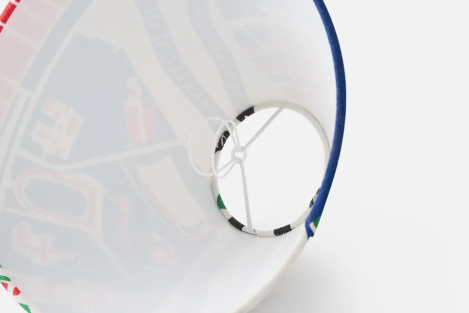 Denna lampskärm i linnekretong har mönstret Svenskt Tenn Est. 1924. Mönstret gick ursprungligen under namnet “Stockholm” när det formgavs av Josef Frank omkring 1949 – 1950. Motivet visar en Stockholmskarta, med utvalda platser som Folkungagatan, Karlavägen, Drottninggatan och Mynttorget. Till Svenskt Tenns hundraårsjubileum 2024 har texten Svenskt Tenn Est. 1924 adderats i textremsorna som flätar samman motivet: en hyllning till de 100 år under vilka företaget funnits och verkat i centrum av den svenska och internationella designscenen.