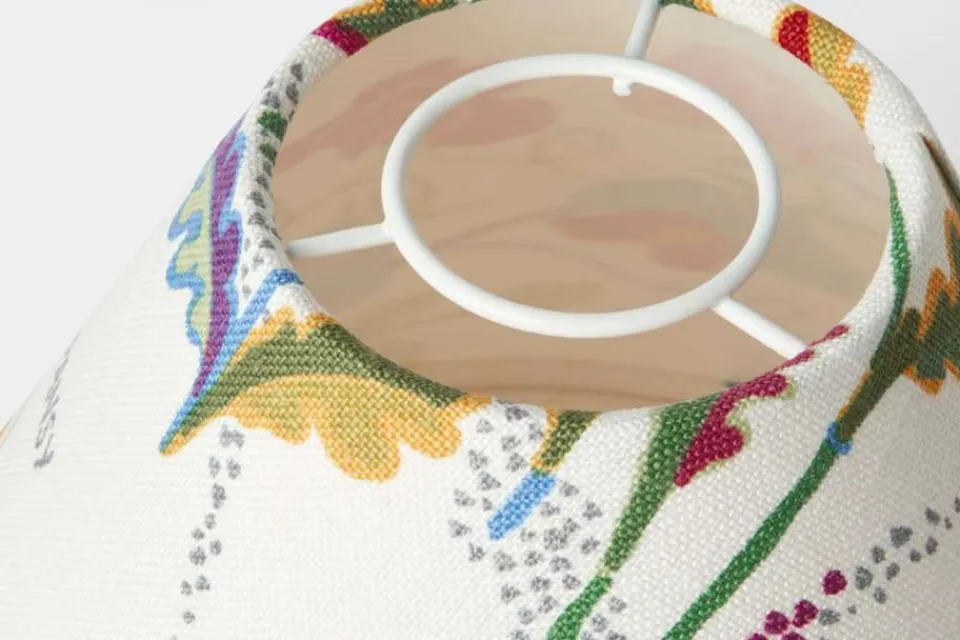 Josef Frank formgav en lampskärm till varje modell av sina lampor. Ursprungligen var de alla i vit textil, men Estrid Ericson lät senare sy upp dem med mönster av Josef Frank och andra formgivare. Denna lampskärm i linnekretong har mönstret California. California är ett av de mönster som formgavs av Josef Frank under perioden 1942 – 1945, som med fog kan kallas ett av hans floraplanschmönster. Förebilden till blommorna i motivet fann han i Gladys Lynwall Pratt’s American Garden Flowers. Sammantaget har Josef Frank ritat in tjugo olika (namngivna) sommarblommor, bland dem krasse, luktärt, pensé, dahlia, petunia och zinnia, som tillsammans hålls ihop av en vindlande prickrabatt.