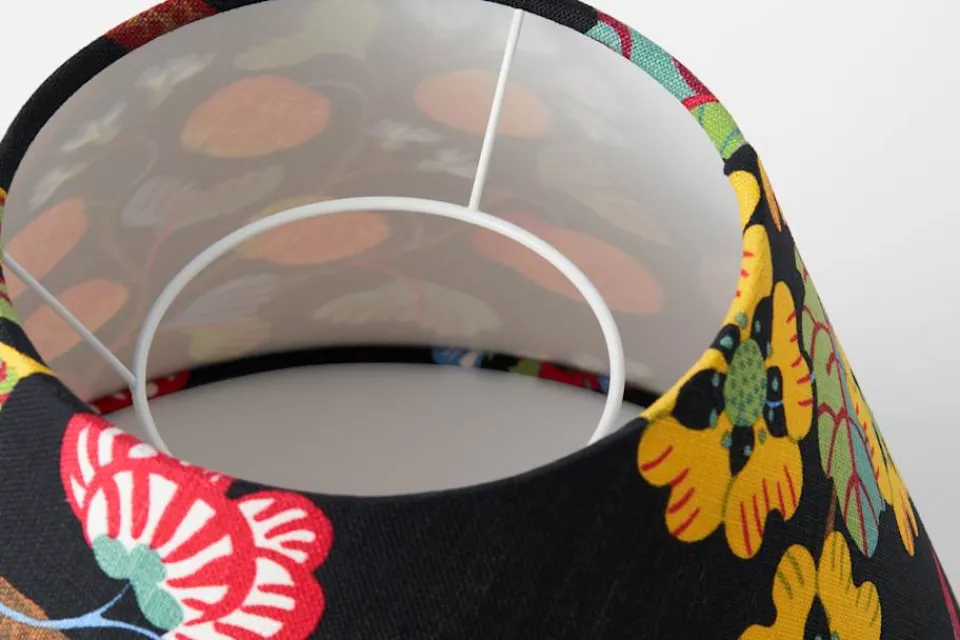 Josef Frank formgav en lampskärm till varje modell av sina lampor. Ursprungligen var de alla i vit textil, men Estrid Ericson lät senare sy upp dem med mönster av Josef Frank och andra formgivare. Denna lampskärm i linnekretong har mönstret Baranquilla. I Josef Franks textil ”Baranquilla” skapar fyra, kärleksfullt utformade lianstammar en vacker helhet fylld av prunkande frukter, blommor och blad. Mönstret ritades 1943-45, under Josef Franks tid i New York – där många av hans fantasifulla mönster med fritt växande livsträd, blommor och frukter tog form. Baranquilla fick sitt namn efter den colombianska hamnstaden vid det Karibiska havet, som Josef Frank och hans fru Anna passerade under exilen från Sverige till Amerika 1941, mitt under brinnande världskrig.