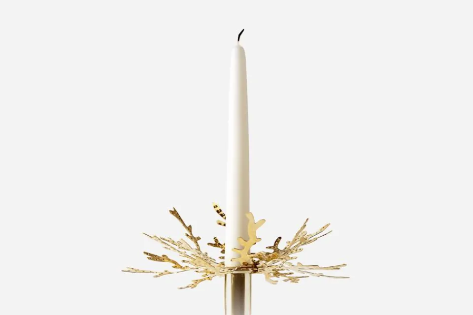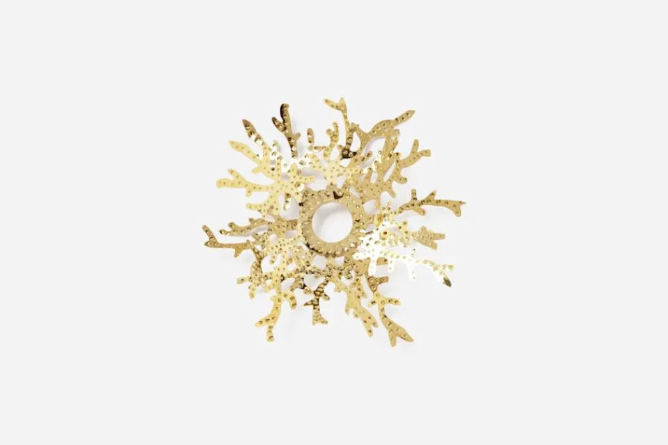Ljusmanschett i mässing formgiven av Luke Edward Hall för Svenskt Tenns julkollektion 2022. Mässingsdekorationerna i kollektionen är inspirerade av barocken och rokokon.