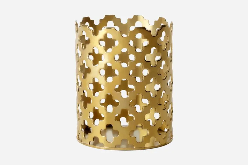 Sara Szyber har ritat ljuslyktan i mässing, vars klövermönster ger snudd på orientaliska skuggor.