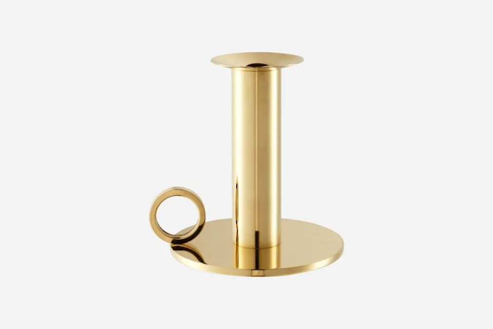 Denna mässingsljusstake, formgiven av Sigurd Persson, är en förenklad form av en klassisk, antik ljusstake. Kammarljusstaken med en högglanspolerad yta är avsedd för kronljus eller liknande.