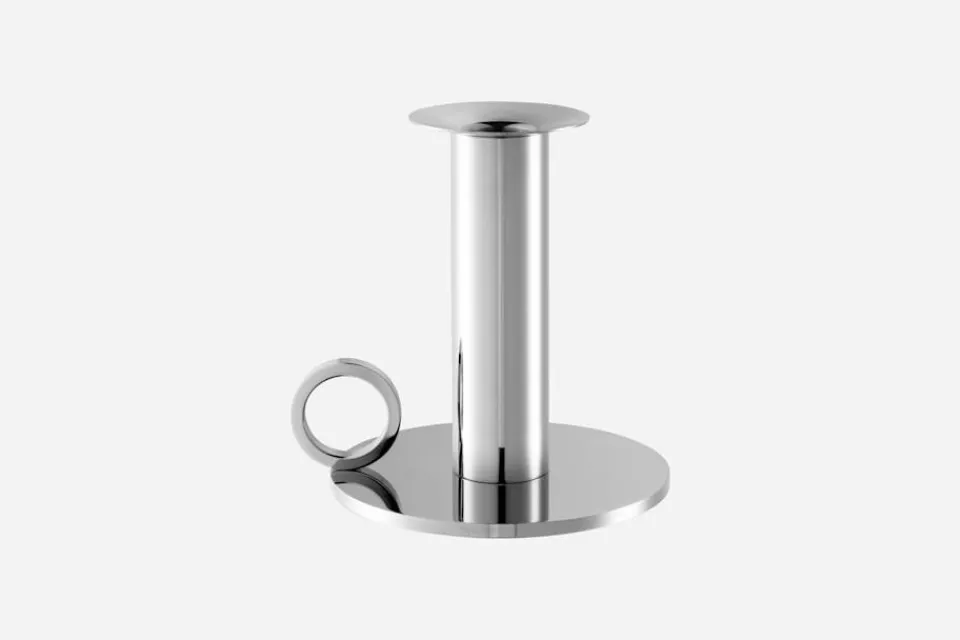Denna ljusstake i rostfritt stål, formgiven av Sigurd Persson, är en förenklad form av en klassisk, antik ljusstake. Kammarljusstaken med en högglanspolerad yta är avsedd för kronljus eller liknande.