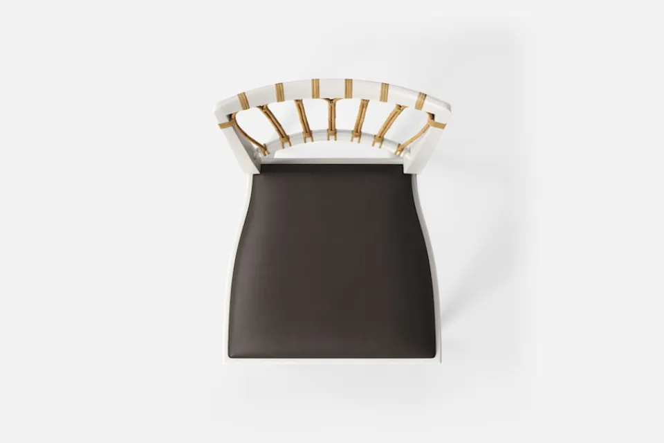 Stol 1165 har en genombruten rygg bestående av lindad rotting. För att skapa en spänning i formen valde Josef Frank ofta att blanda olika träslag och material. Stol 1165 formgavs av Josef Frank 1947.