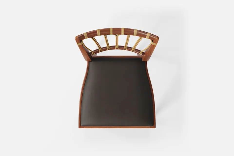 Stol 1165 har en genombruten rygg bestående av lindad rotting. För att skapa en spänning i formen valde Josef Frank ofta att blanda olika träslag och material. Stol 1165 formgavs av Josef Frank 1947.