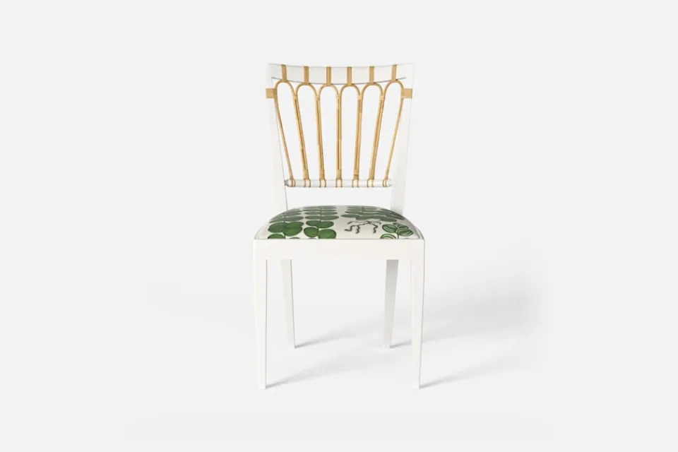 Stol 1165 har en genombruten rygg bestående av lindad rotting. För att skapa en spänning i formen valde Josef Frank ofta att blanda olika träslag och material. Stol 1165 formgavs av Josef Frank 1947.
