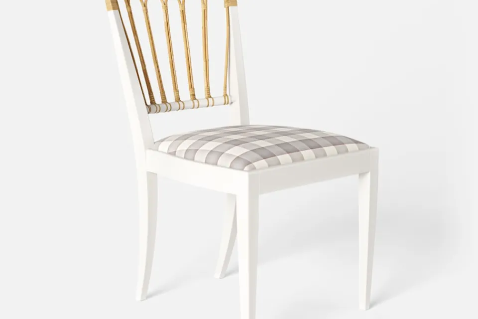 Stol 1165 har en genombruten rygg bestående av lindad rotting. För att skapa en spänning i formen valde Josef Frank ofta att blanda olika träslag och material. Stol 1165 formgavs av Josef Frank 1947.