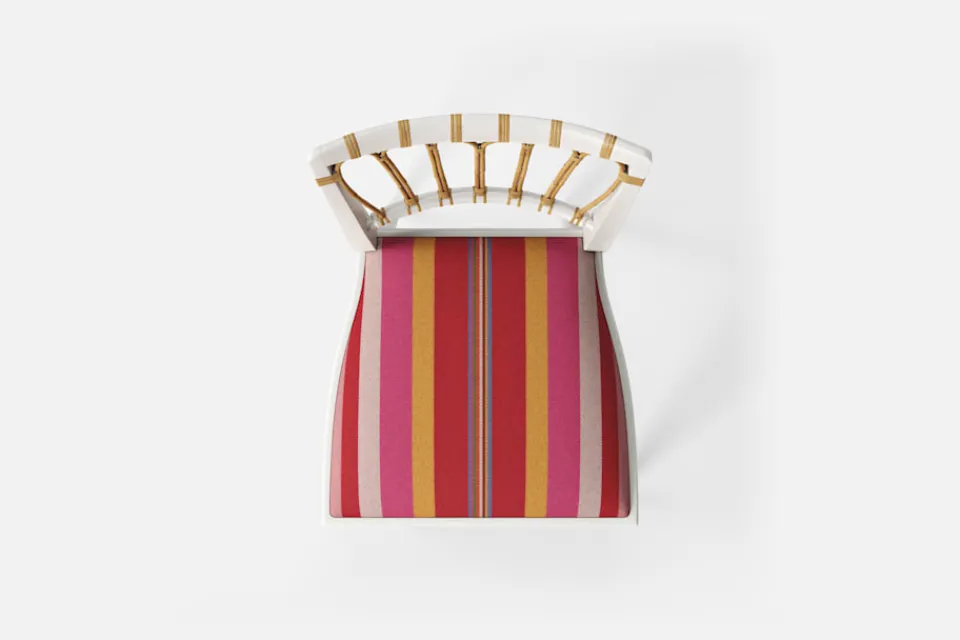 Stol 1165 har en genombruten rygg bestående av lindad rotting. För att skapa en spänning i formen valde Josef Frank ofta att blanda olika träslag och material. Stol 1165 formgavs av Josef Frank 1947.