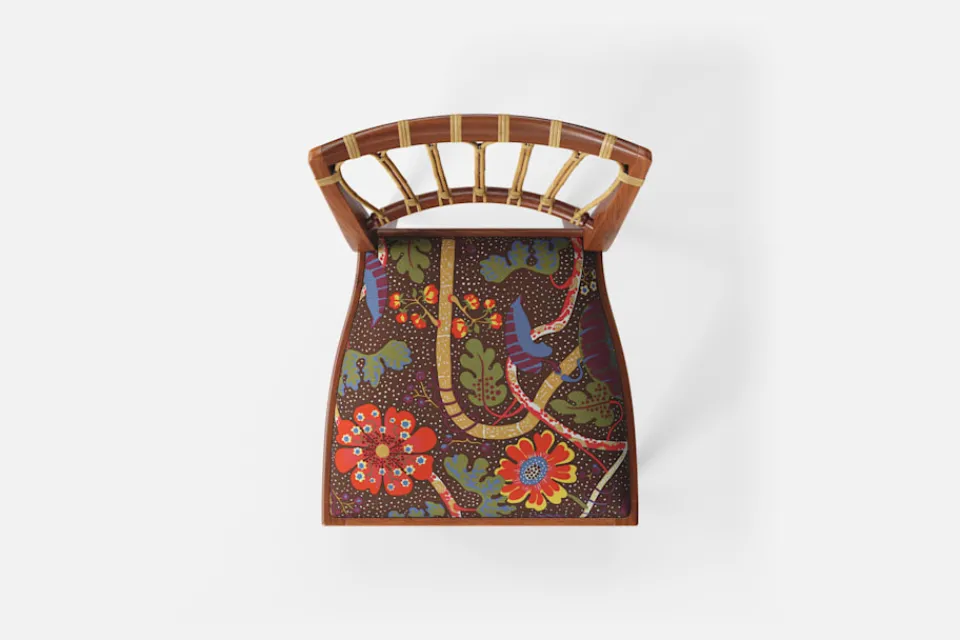 Stol 1165 har en genombruten rygg bestående av lindad rotting. För att skapa en spänning i formen valde Josef Frank ofta att blanda olika träslag och material. Stol 1165 formgavs av Josef Frank 1947.