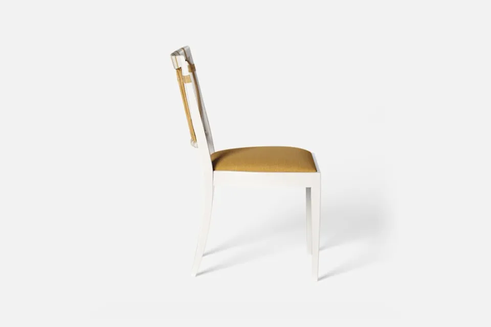 Stol 1165 har en genombruten rygg bestående av lindad rotting. För att skapa en spänning i formen valde Josef Frank ofta att blanda olika träslag och material. Stol 1165 formgavs av Josef Frank 1947.