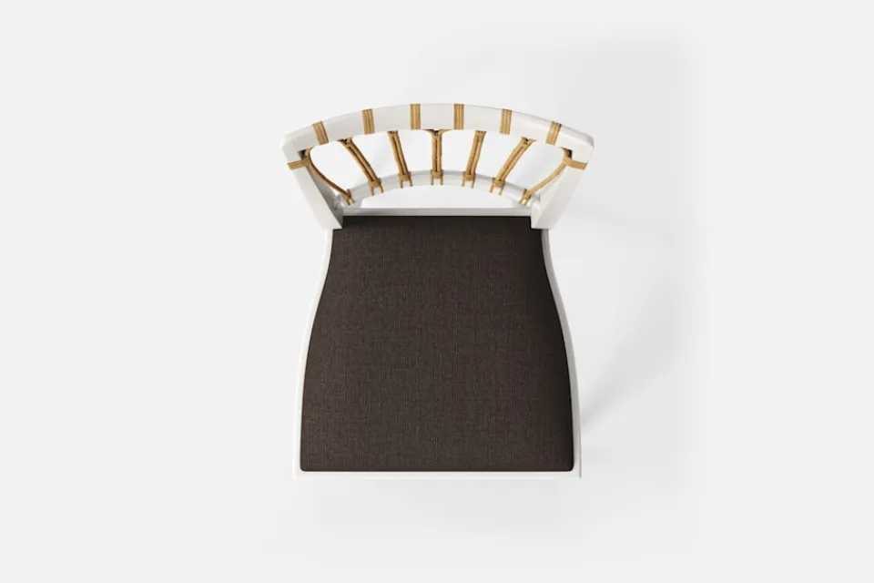 Stol 1165 har en genombruten rygg bestående av lindad rotting. För att skapa en spänning i formen valde Josef Frank ofta att blanda olika träslag och material. Stol 1165 formgavs av Josef Frank 1947.