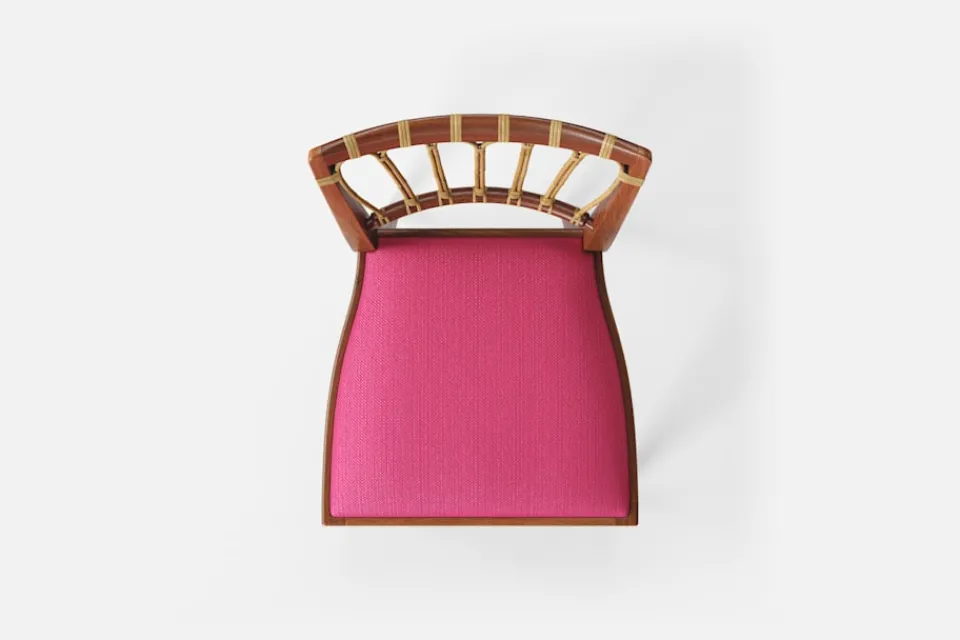 Stol 1165 har en genombruten rygg bestående av lindad rotting. För att skapa en spänning i formen valde Josef Frank ofta att blanda olika träslag och material. Stol 1165 formgavs av Josef Frank 1947.