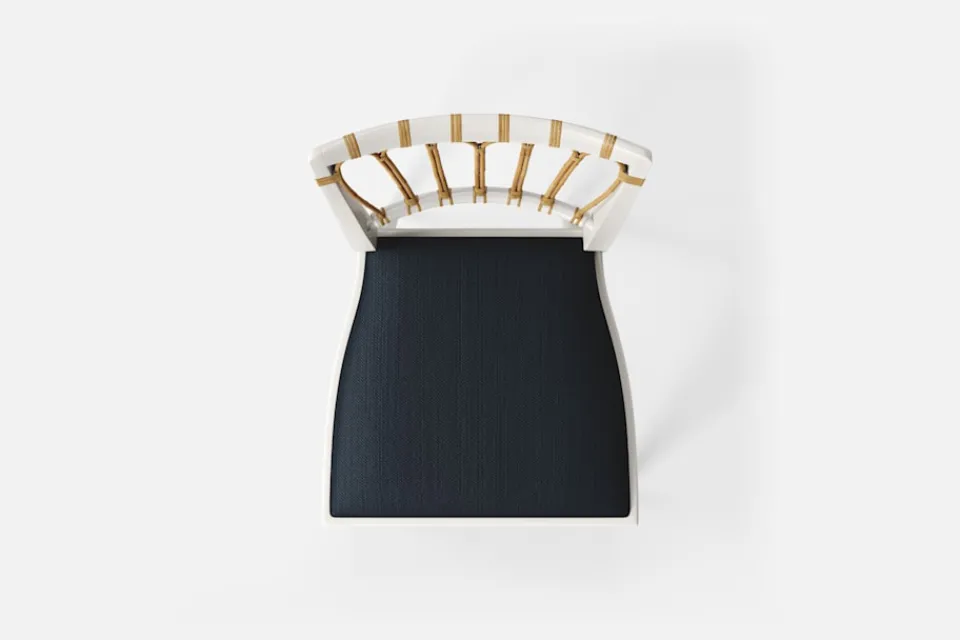 Stol 1165 har en genombruten rygg bestående av lindad rotting. För att skapa en spänning i formen valde Josef Frank ofta att blanda olika träslag och material. Stol 1165 formgavs av Josef Frank 1947.
