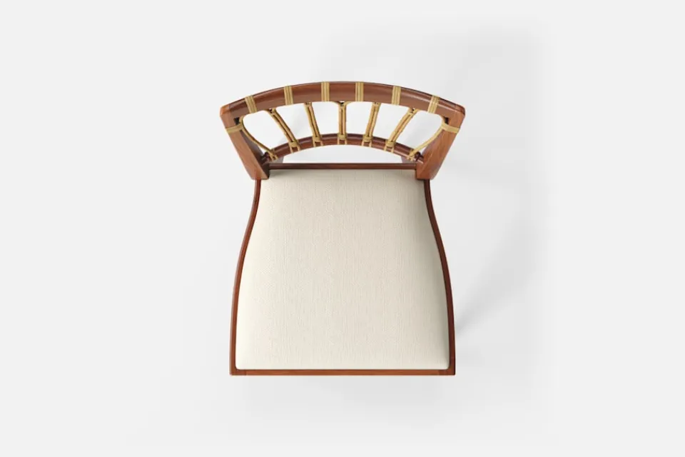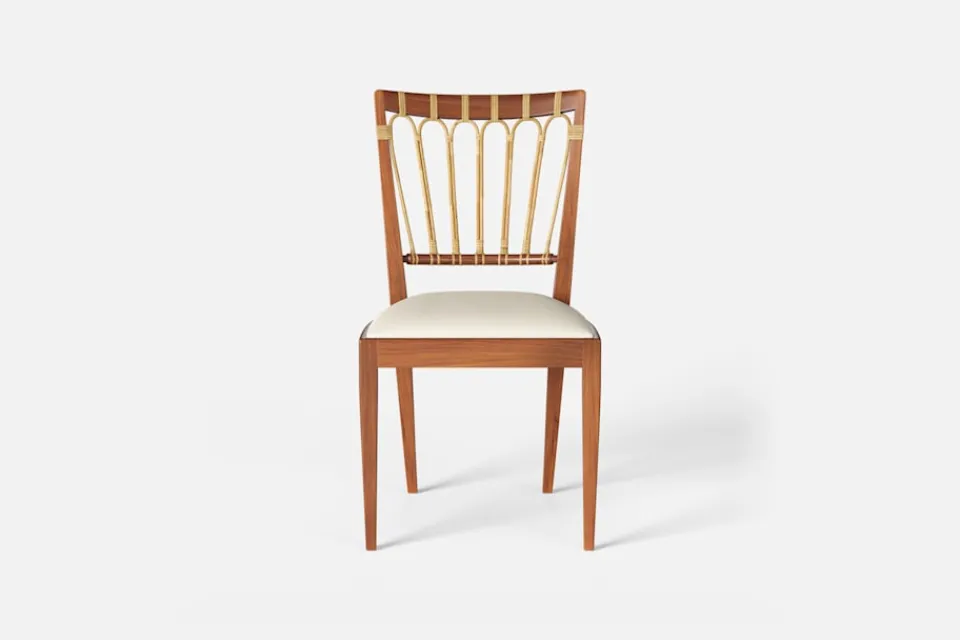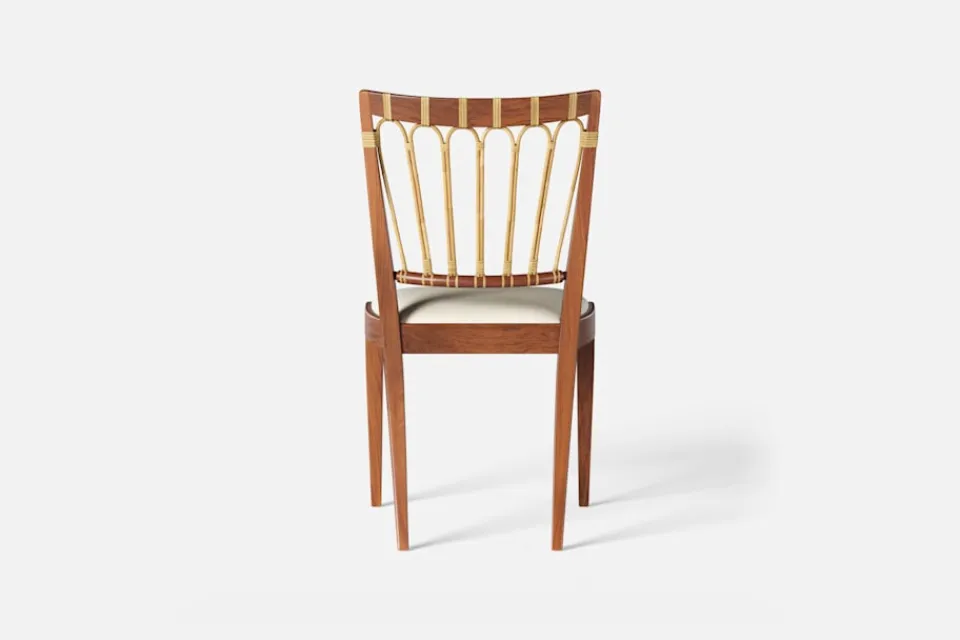 Stol 1165 har en genombruten rygg bestående av lindad rotting. För att skapa en spänning i formen valde Josef Frank ofta att blanda olika träslag och material. Stol 1165 formgavs av Josef Frank 1947.