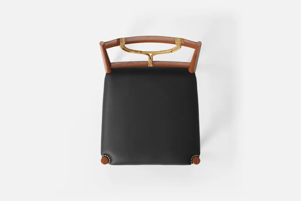 Underredet med sina fyra sidoslåar och två tvärslåar ger stolen stadga och leder blicken upp mot den generöst tilltagna rygglyran av dubbla rottingrör, som tillverkas för hand av Larsson Korgmakare i Stockholm. Som ett smycke pryder rottinglyran den lätta stolen, som troligen var den sista som Josef Frank ritade under sin livstid.