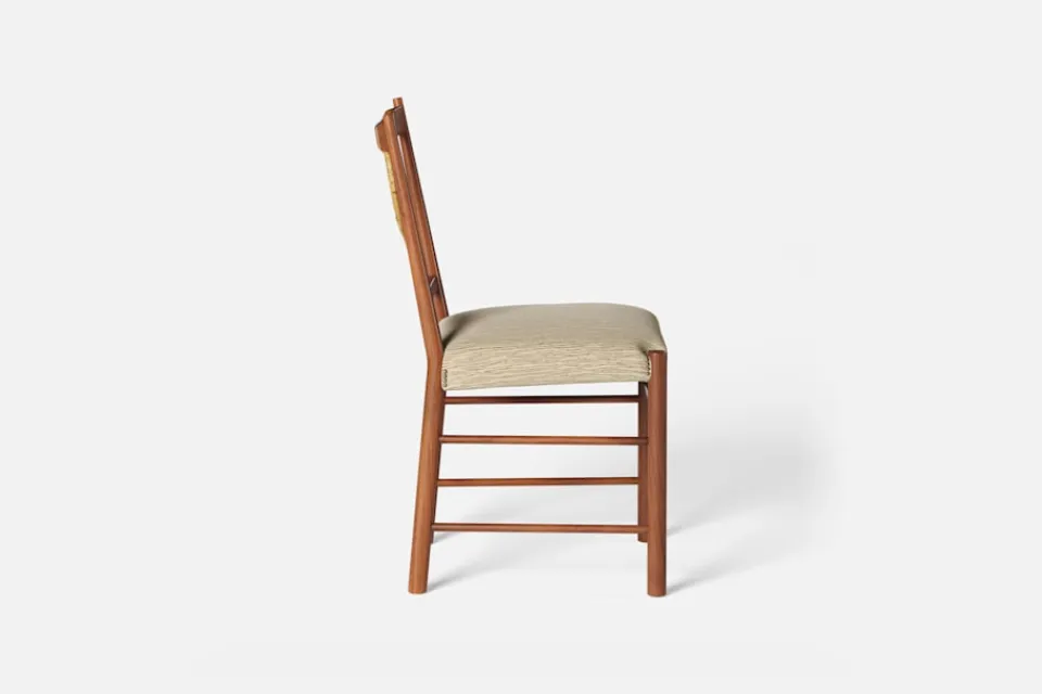 Underredet med sina fyra sidoslåar och två tvärslåar ger stolen stadga och leder blicken upp mot den generöst tilltagna rygglyran av dubbla rottingrör, som tillverkas för hand av Larsson Korgmakare i Stockholm. Som ett smycke pryder rottinglyran den lätta stolen, som troligen var den sista som Josef Frank ritade under sin livstid.