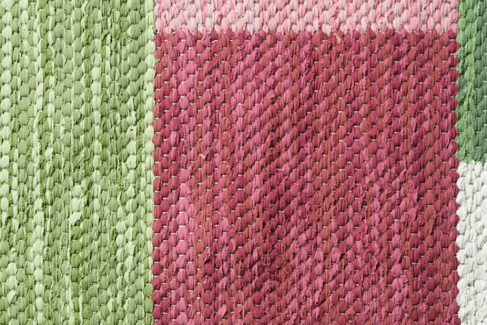 I början kan remsorna fälla trådar. Detta är en del av mattans utseende och karaktär och kommer att avta med tiden. Mattan är vävd av resttyger från produktionen av Svenskt Tenns linnetyg och Josef Franks textilier.