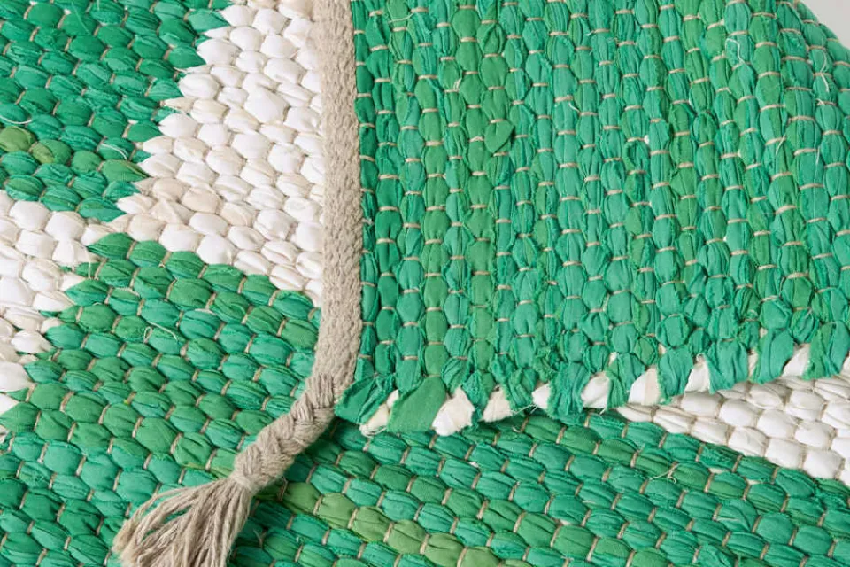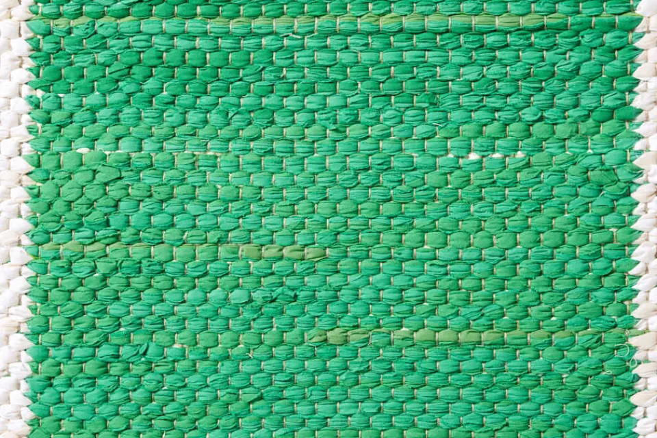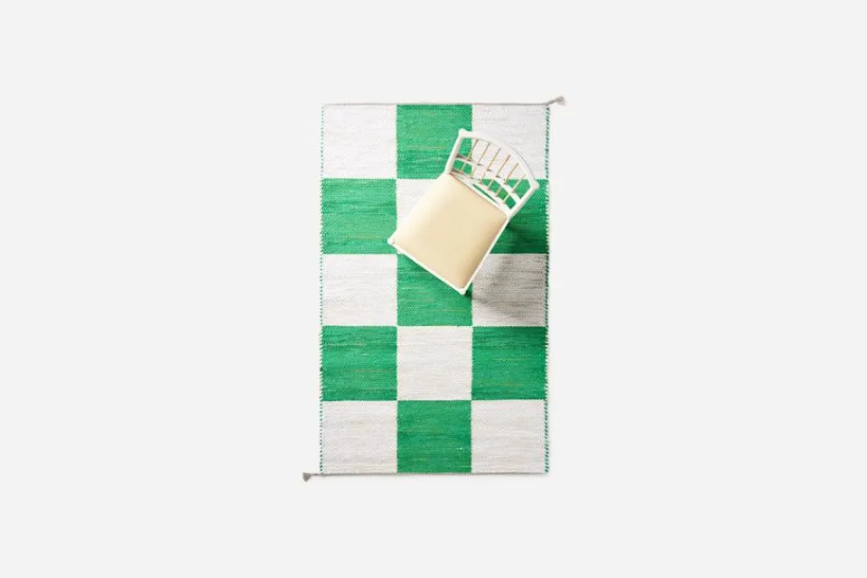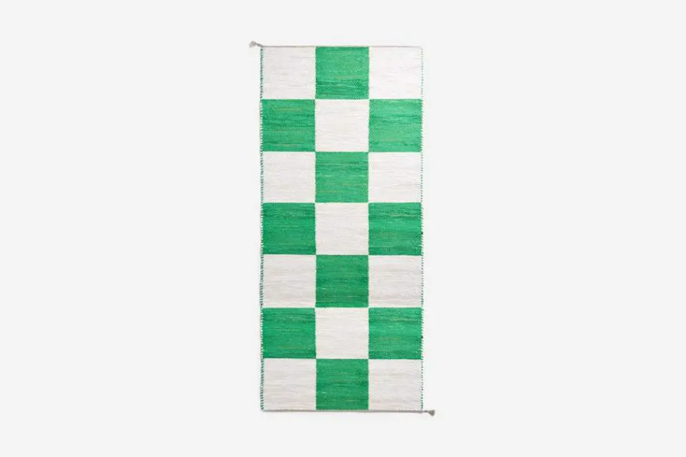 Svenskt Tenns dubbelvävda trasmatta ”Schackrutan” är formgiven av Margit Thorén under 1940-talet.