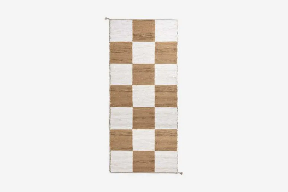 Svenskt Tenns dubbelvävda trasmatta ”Schackrutan” är formgiven av Margit Thorén under 1940-talet.