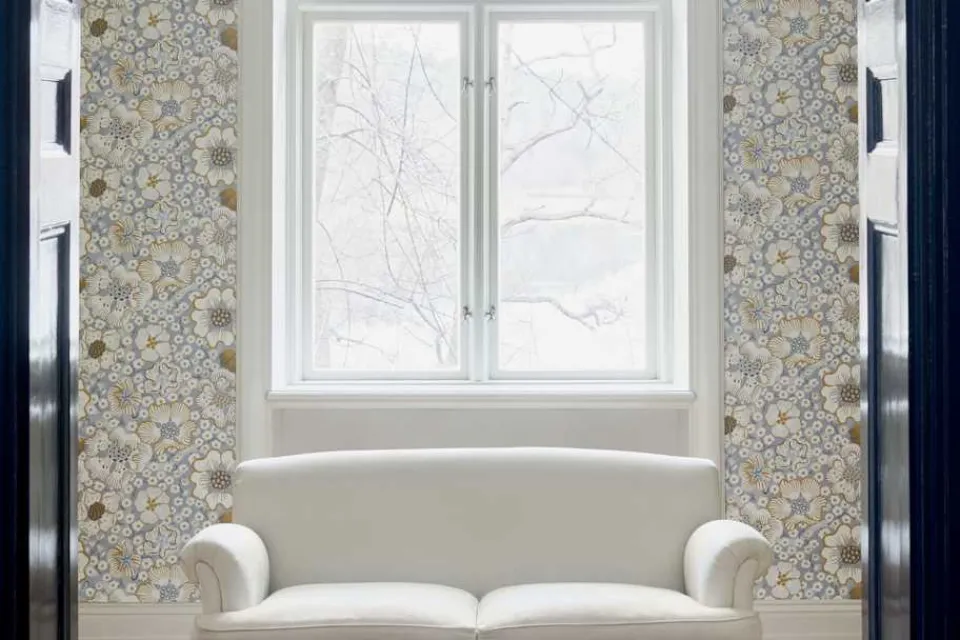I tapeten Eldblommans mönster ser man hur den grova stjälken som löper snett uppåt omslingras av en småblommig klätterväxt. De tunna spirallinjerna och de små blommorna blir behövliga motvikter till det stora och kraftfulla.