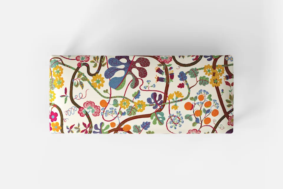 Denna rektangulära, stramt utformade pall med sits i tyg eller skinn formgavs av Josef Frank år 1950. De fyrkantiga benen har den typiska hörnprofileringen som kännetecknar Josef Franks formgivning. Benställningens H-kryss för tankarna till 1700-talets möbelformgivning.