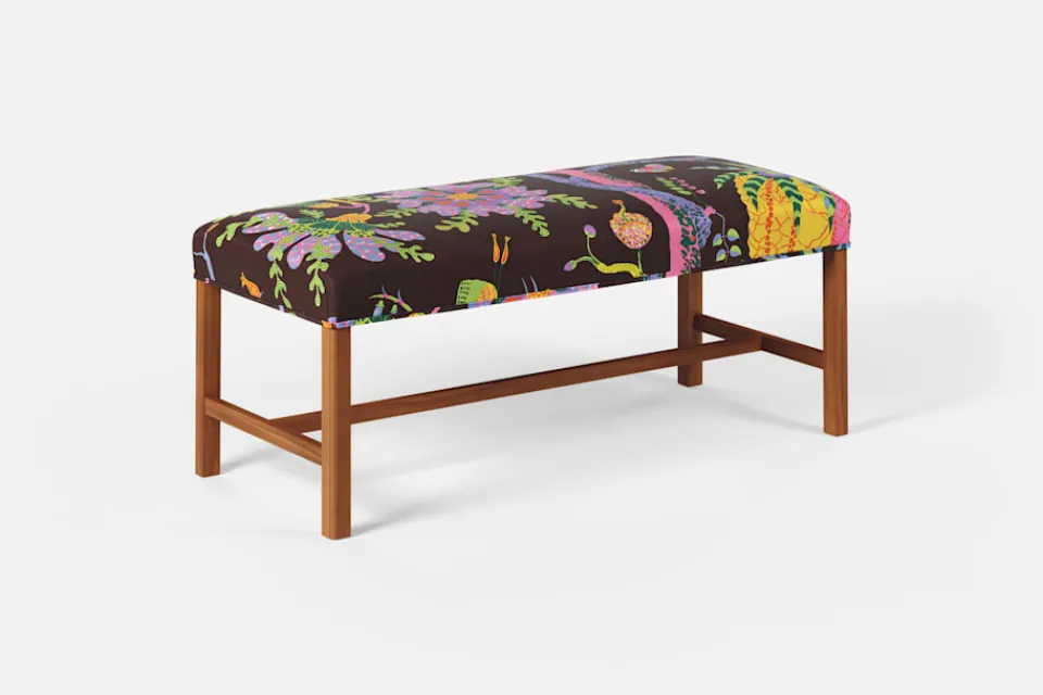 Denna rektangulära, stramt utformade pall med sits i tyg eller skinn formgavs av Josef Frank år 1950. De fyrkantiga benen har den typiska hörnprofileringen som kännetecknar Josef Franks formgivning. Benställningens H-kryss för tankarna till 1700-talets möbelformgivning.