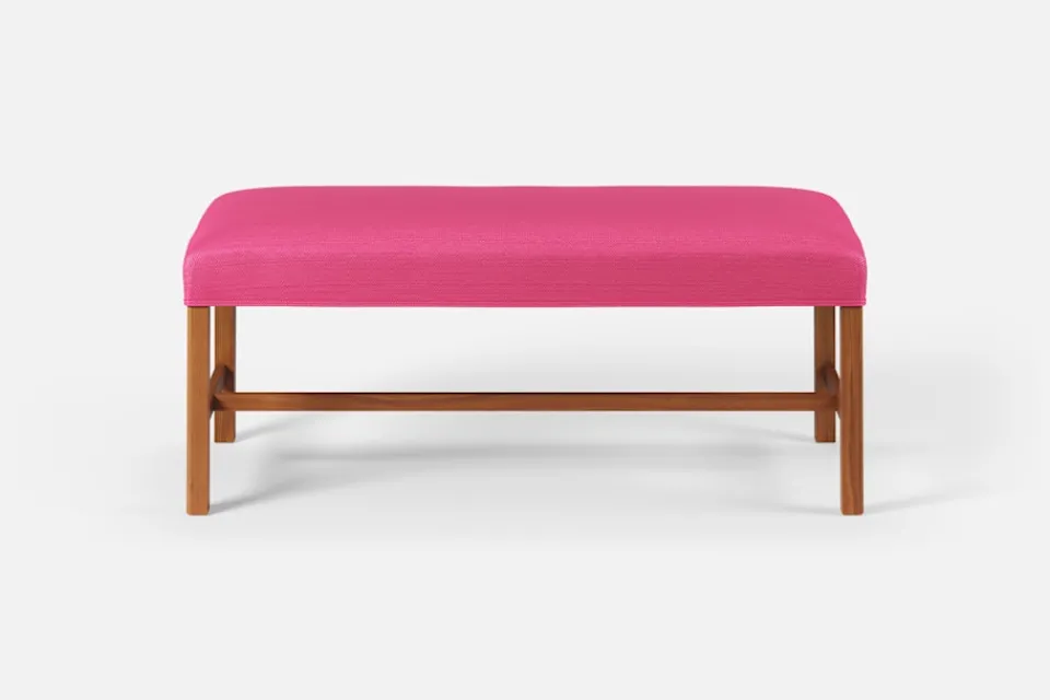 Denna rektangulära, stramt utformade pall med sits i tyg eller skinn formgavs av Josef Frank år 1950. De fyrkantiga benen har den typiska hörnprofileringen som kännetecknar Josef Franks formgivning. Benställningens H-kryss för tankarna till 1700-talets möbelformgivning.