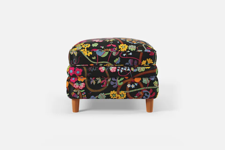 Denna fotpall formgavs av Josef Frank år 1936 tillsammans med fåtölj 568. Den generösa sittplymån under dynan och de facetterade nedåt avsmalnande benen är typiska för Josef Franks formspråk.