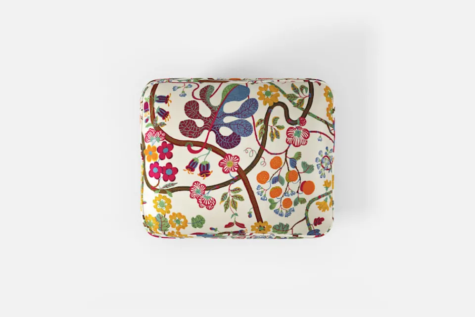 Denna fotpall formgavs av Josef Frank år 1936 tillsammans med fåtölj 568. Den generösa sittplymån under dynan och de facetterade nedåt avsmalnande benen är typiska för Josef Franks formspråk.