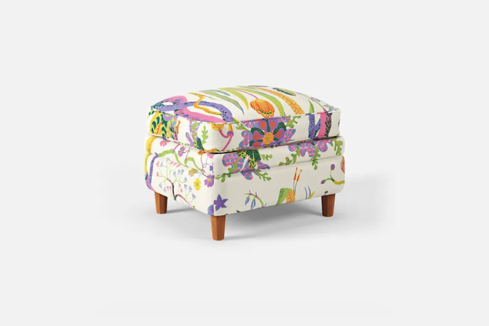 Denna fotpall formgavs av Josef Frank år 1936 tillsammans med fåtölj 568. Den generösa sittplymån under dynan och de facetterade nedåt avsmalnande benen är typiska för Josef Franks formspråk.