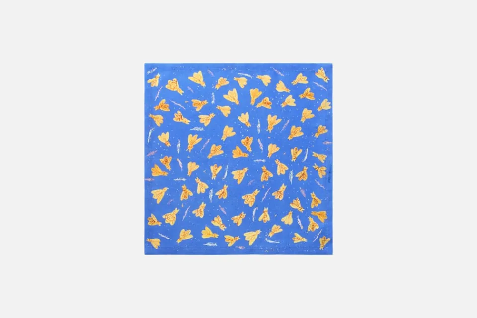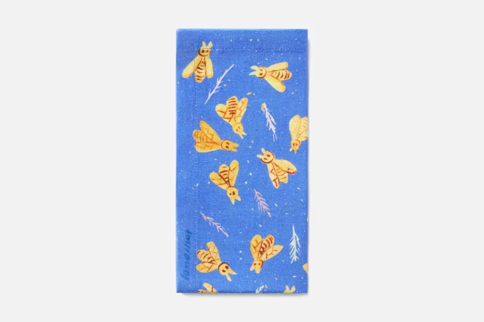 En vacker linneservett med motiv av den grekiske konstnären Alekos Fassianos. Här syns två av hans återkommande motiv såsom biet och vetestrået – båda karaktäristiska för hans distinkta formspråk och symboler för rörelse och frihet.