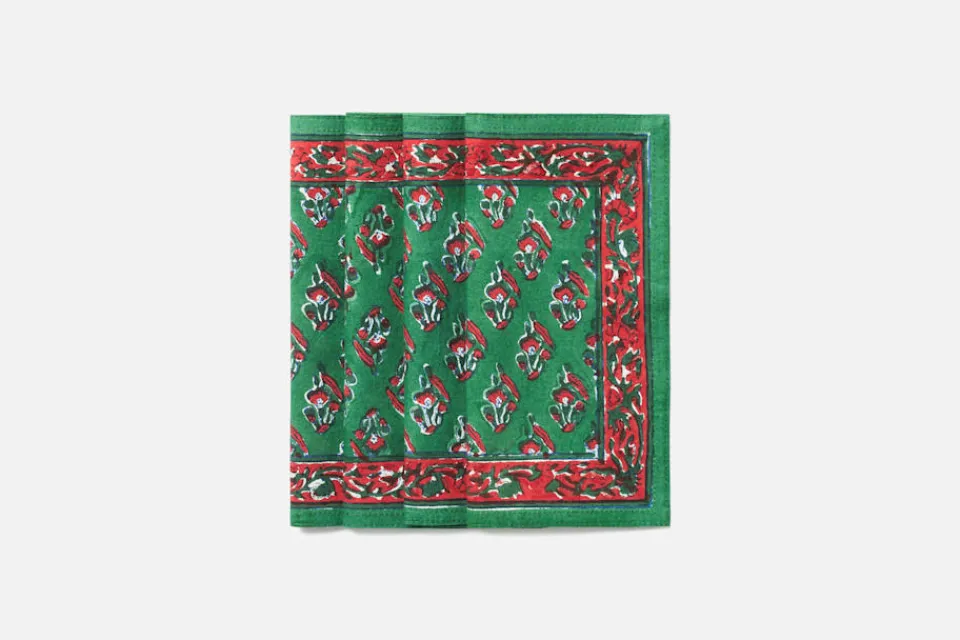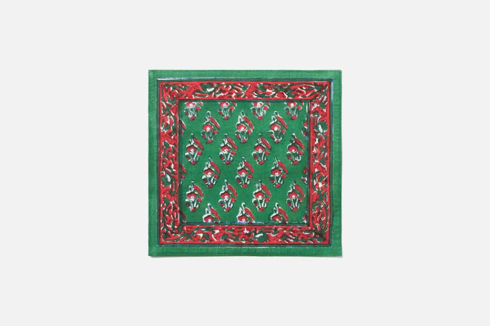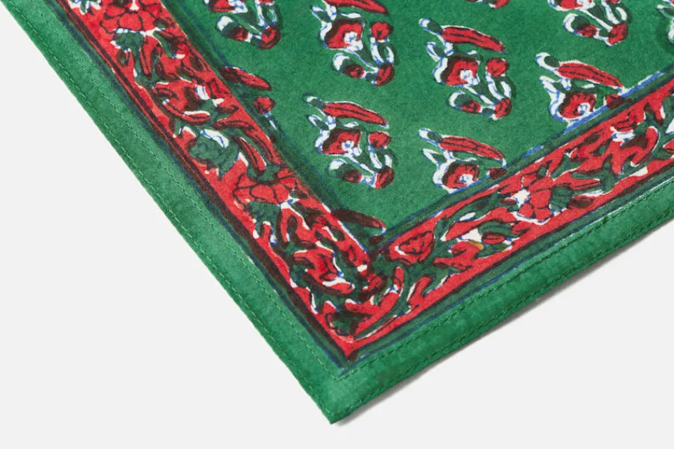 En grön servett i mjukt bomullstyg som smyckas av vackra, blocktryckta blommor i röda och gröna toner. Textilen trycks för hand på ett litet, familjeägt företag i Jaipur, Indien. Mönsterblocket skärs ur ett träblock, doppas sedan i färg och trycks mot tyget som en stämpel. Blocktrycket är en konstform; en tillverkningsmetod som kräver enorm precision och hantverksskicklighet.