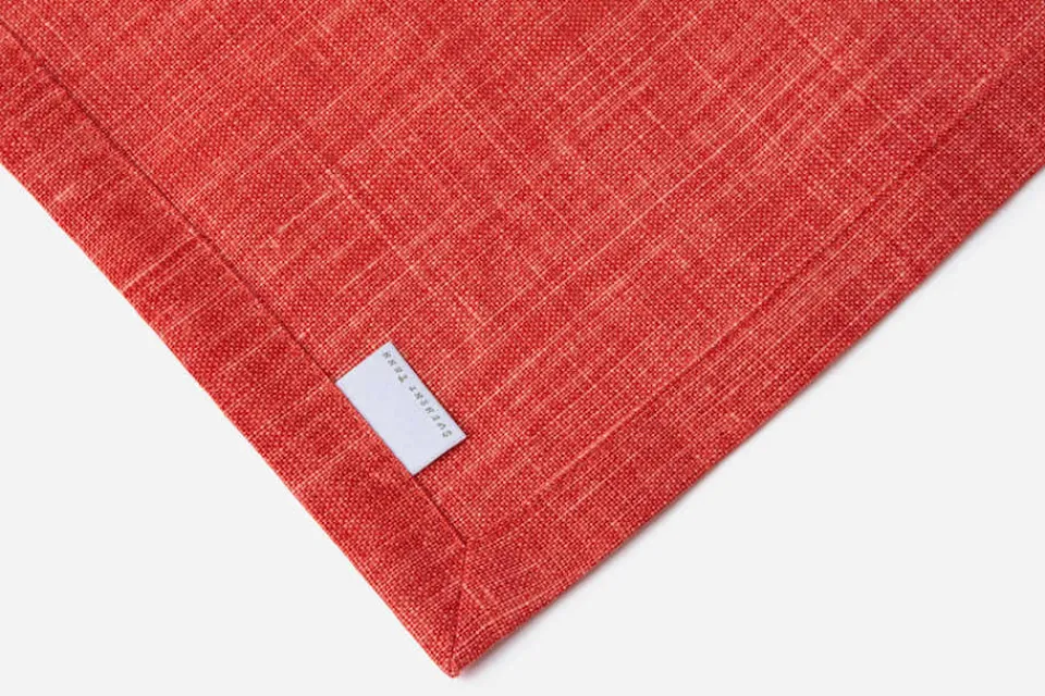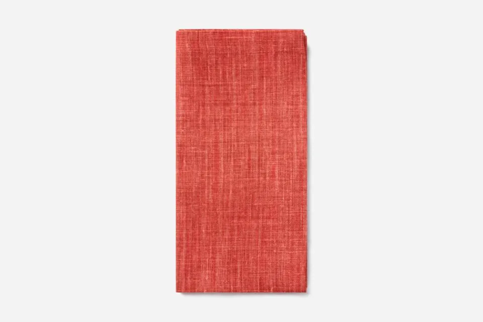 Tygservett i Svenskt Tenns eget, enfärgade linnetyg i korall. servetten kan kombineras såväl med enfärgade som mönstrade dukar och textilier.