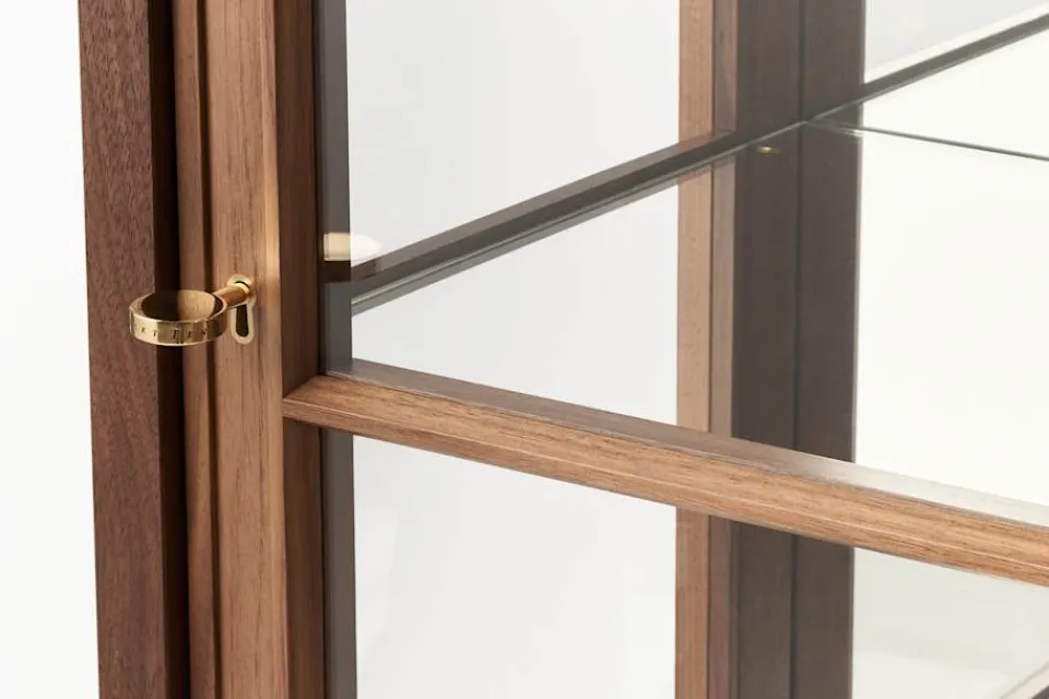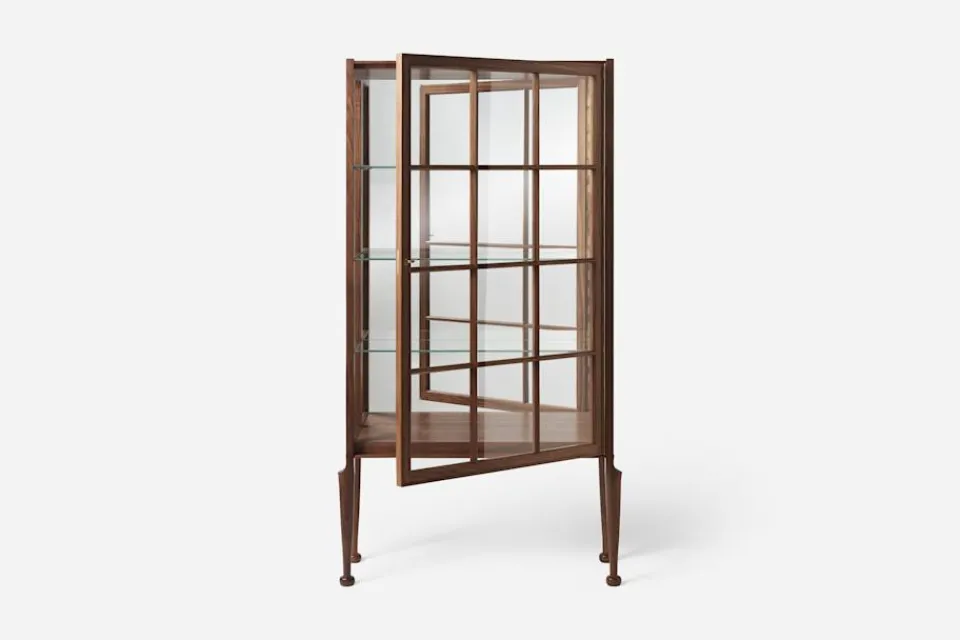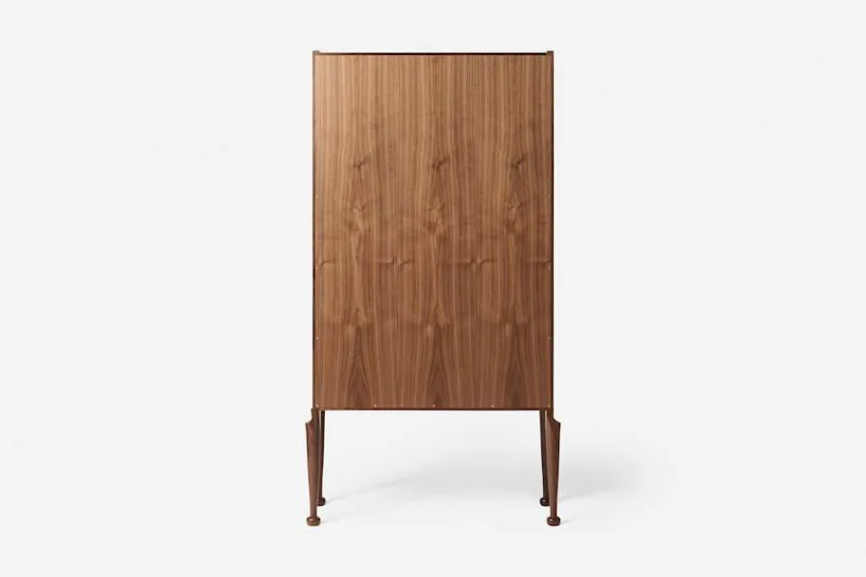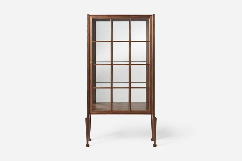 Ett stort vitrinskåp i valnöt och glas, formgivet av Josef Frank 1957. Denna vitrin, med cabriole-ben och så kallade ”klubbfötter”, är ett typiskt exempel på ett engelskt ”display cabinet” – perfekt för att visa upp vackra och spännande föremål i ett hem. Josef Frank ansåg att vitrinen gärna fick ingå i en modern inredning, och menade att föremålen som placeras i skåpet inte nödvändigtvis behöver vara av samma slag. Istället bör vackra saker blandas med nyttiga, så som man ju brukar göra i hemmet i övrigt.
