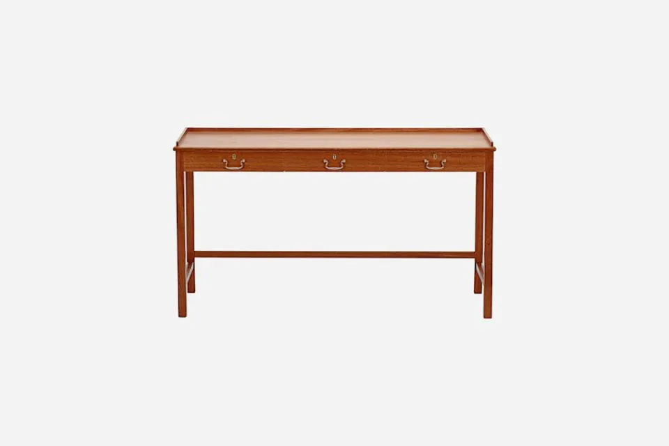 Det här bordet formgavs av Josef Frank runt 1950 och fungerar utmärkt såväl som både sideboard och skrivbord. Med sin för Josef Frank typiska sarg i ryggen kan det också ställas fritt i rummet, vilket inte bara gör det vackert att vila blicken på utan också praktiskt att möblera med.