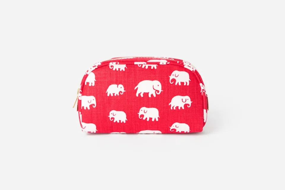 Både vacker och praktisk är necessären, med dragkedja i mässing och mönster av Estrid Ericson. Svenskt Tenns grundare reste mycket och tog ofta med sig olika mönster, former och souvenirer hem. Det var efter en förlaga från Belgiska Kongo som hon formgav mönstret med de små elefanterna. Textil Elefant trycktes för första gången i slutet av 1930-talet.