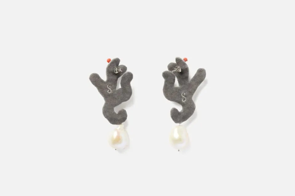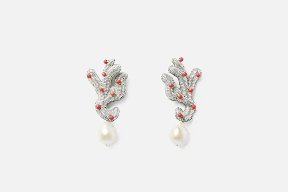 Dessa vackert broderade, korallformade örhängen med pärlor är formgivna av smyckekonstnären Sophia Edstrand. Örhängena är lätta i vikt och bekväma att bära. Det unika uttrycket gör dem till enastående smycken som håller över tid. Varje smycke från Sophia 203 tillverkas för hand av skickliga hantverkare i Jaipur, där trådar av silke och zari broderas på en bas av mjuk sammet. Resultatet är ett detaljrikt och slående vackert hantverk.