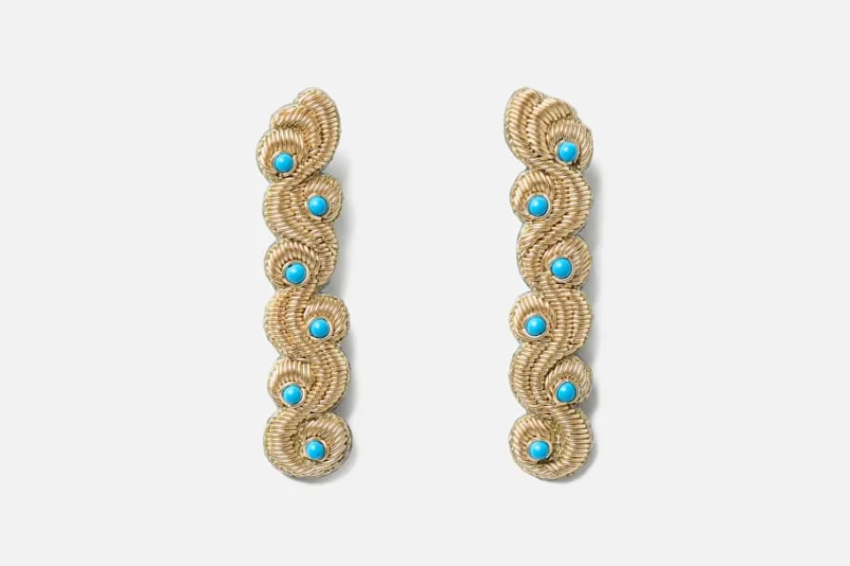 Dessa vackert broderade örhängen med pärlor är formgivna av smyckekonstnären Sophia Edstrand. Örhängena är lätta i vikt och bekväma att bära. Det unika uttrycket gör dem till enastående smycken som håller över tid. Varje smycke från Sophia 203 tillverkas för hand av skickliga hantverkare i Jaipur, där trådar av silke och zari broderas på en bas av mjuk sammet. Resultatet är ett detaljrikt och slående vackert hantverk.