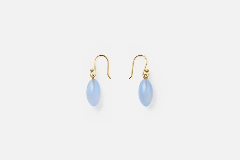 Dessa droppformade örhängen i guld med ljusblå stenpärla är formgivna av Ted Muehling. Sedan 1976 har han skapat unika smycken med naturen som inspiration, och varje par tillverkas omsorgsfullt för hand i hans studio i New York.