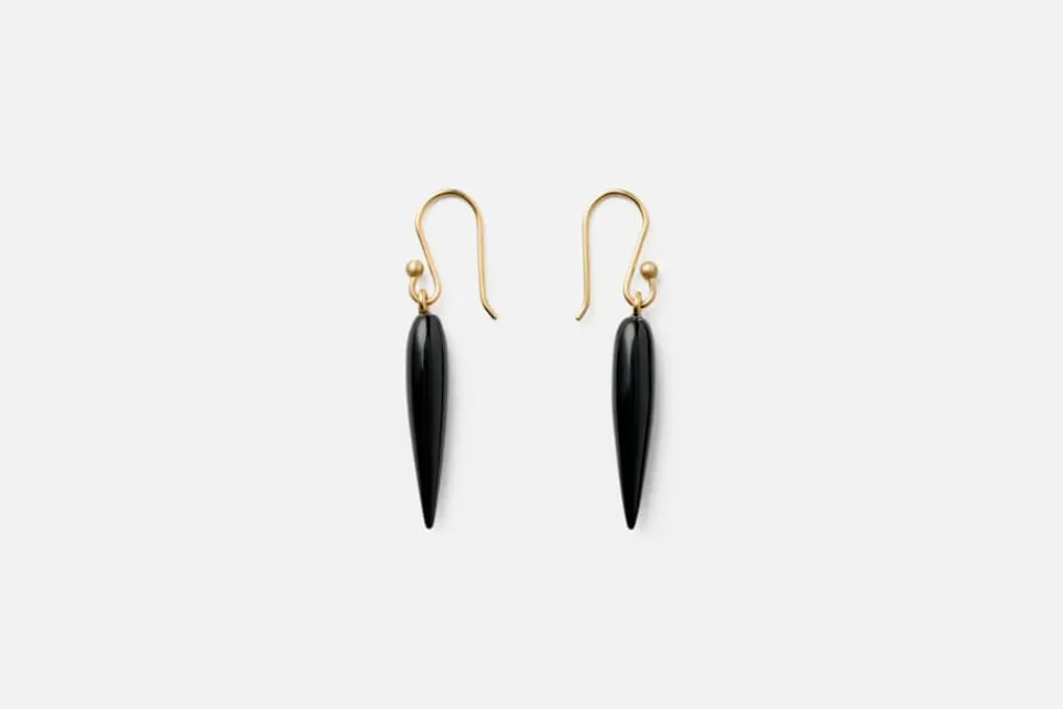 I dessa örhängen i guld formar den svarta ädelstenen Onyx en avlång, riskornsformad dekoration. Örhängena är skapade av Ted Muehling, som sedan 1976 har formgivit unika smycken med naturen som inspiration. Varje par tillverkas omsorgsfullt för hand i hans studio i New York.
