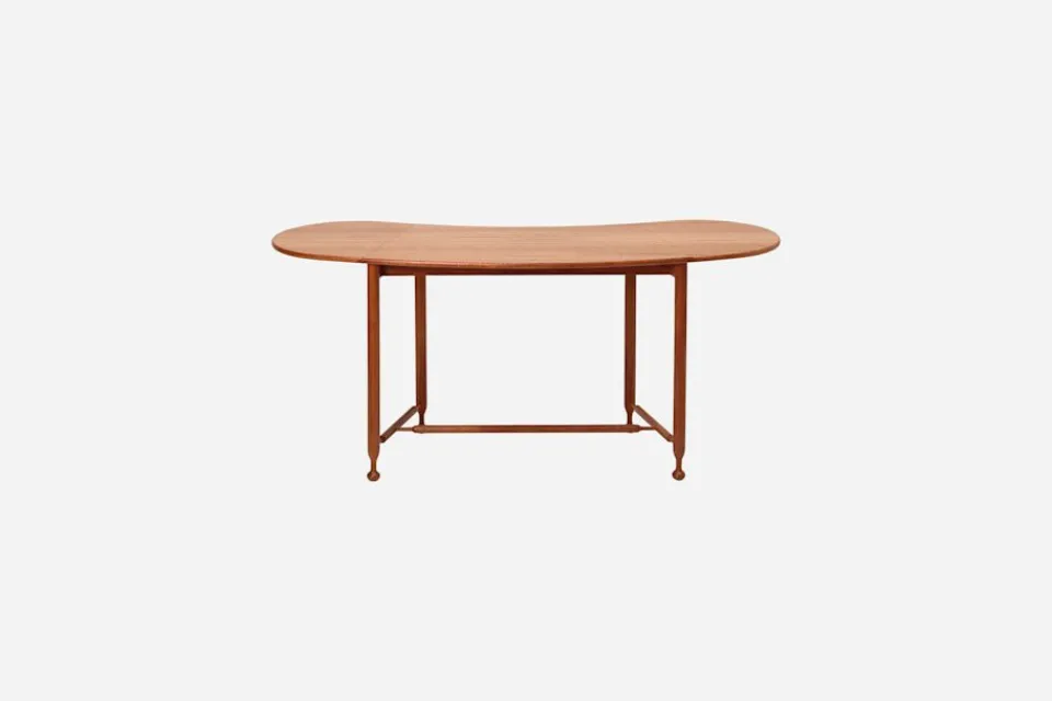 Klaffbord 1133 ritades av Josef Frank under första året i exil på Manhattan 1942. Med sina två, fällbara klaffar är det tänkt som ett praktiskt småbord att placera intill soffan eller nära fåtöljen i läshörnan. Formgivningen bygger på en spännande kontrast mellan den organiska, slutna njurformen och det genomsiktliga spjälverket som bär upp skivan.