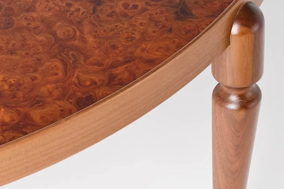 Ben i svarvad valnöt och sarg i formpressad valnöt. Bordskiva av almrotsfanér.