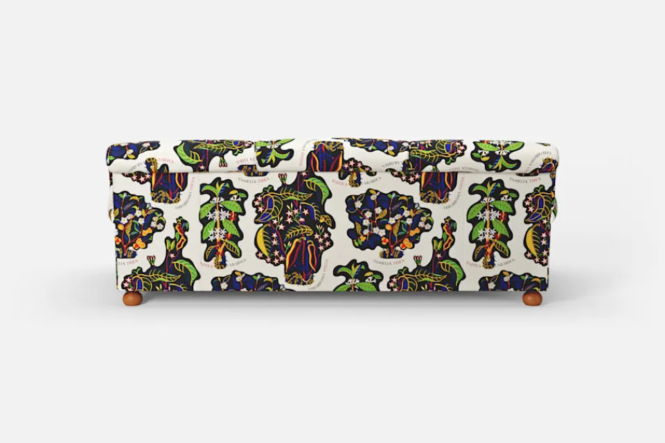Josef Frank formgav den här långa, rymliga soffan under 1930-talets andra hälft. Ryggpartiet delas av rep vilket utgör en spännande dekor. Enligt Josef Frank skulle också det moderna hemmet vara en plats för vila och bekvämlighet, sittplymåer och dubbla fjädersystem ger en utmärkt komfort.