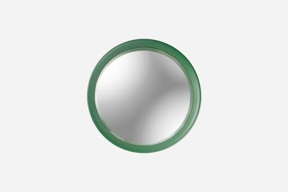Den runda formen återkommer ständigt i Josef Franks formgivning, inte minst i denna spegel från 1930-talet, med konformad ram och konvext spegelglas. Inspiration hämtade han från renässansen, en tid då man gärna använde konvexa speglar för att fånga hela rummet liksom i en tavla. Konvexa speglar finns också allegoriskt avbildade i målningar som ”Arnolfinis bröllop” av Jan van Eyck från 1434.