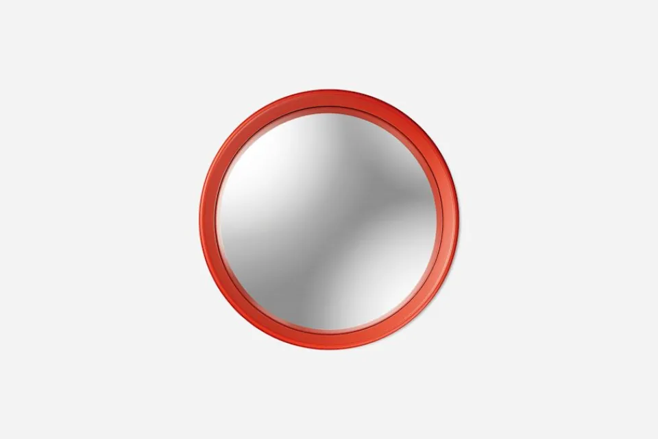 Den runda formen återkommer ständigt i Josef Franks formgivning, inte minst i denna spegel från 1930-talet, med konformad ram och konvext spegelglas. Inspiration hämtade han från renässansen, en tid då man gärna använde konvexa speglar för att fånga hela rummet liksom i en tavla. Konvexa speglar finns också allegoriskt avbildade i målningar som ”Arnolfinis bröllop” av Jan van Eyck från 1434.