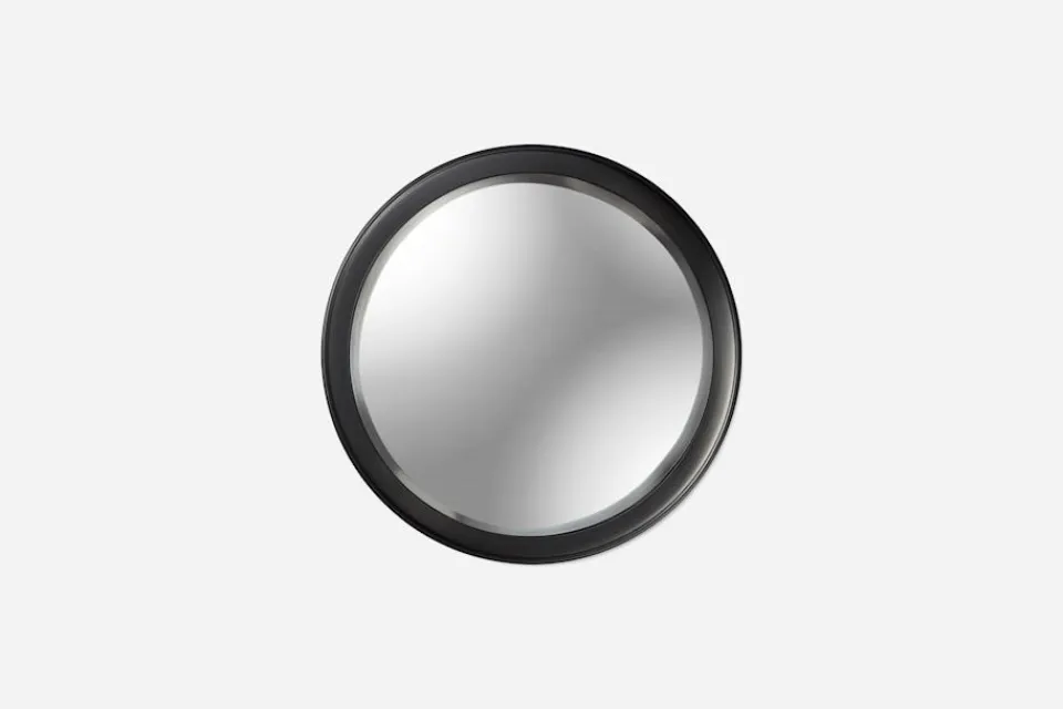 Den runda formen återkommer ständigt i Josef Franks formgivning, inte minst i denna spegel från 1930-talet, med konformad ram och konvext spegelglas. Inspiration hämtade han från renässansen, en tid då man gärna använde konvexa speglar för att fånga hela rummet liksom i en tavla. Konvexa speglar finns också allegoriskt avbildade i målningar som ”Arnolfinis bröllop” av Jan van Eyck från 1434.
