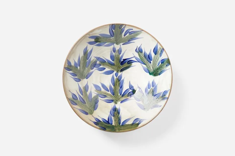 En fin serveringsskål med gröna blad och blå blommor i symmetriskt mönster: ett frodigt lövverk som passar till sommarens alla middagsbjudningar. Skålen från Malaika är ett samtida egyptiskt hantverk, och ett vackert exempel på den originella keramik som tillverkas för hand i Fayoum i Egypten.