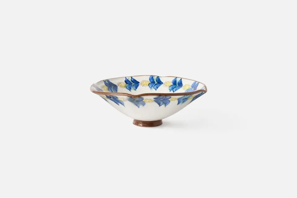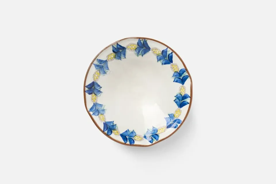 Den djupa serveringsskålen Manial har ett vackert, handmålat mönster med cirklande vetestrån i blått, grönt och bärnstenstoner. Skålen är ett vackert exempel på den originella keramik som tillverkas för hand i Fayoum i Egypten, och blir ett dekorativt inslag i din dukning.